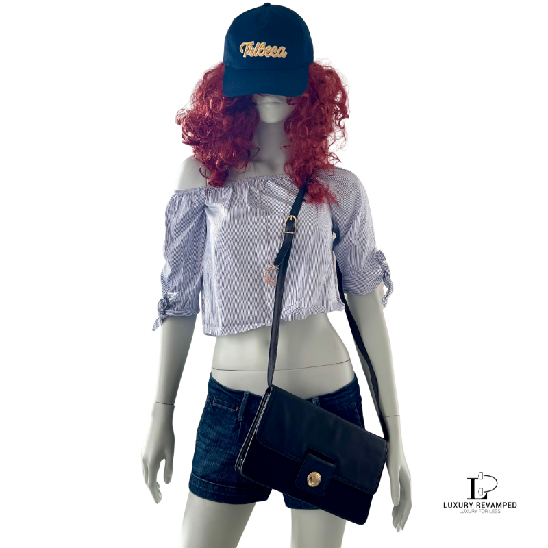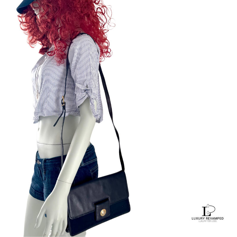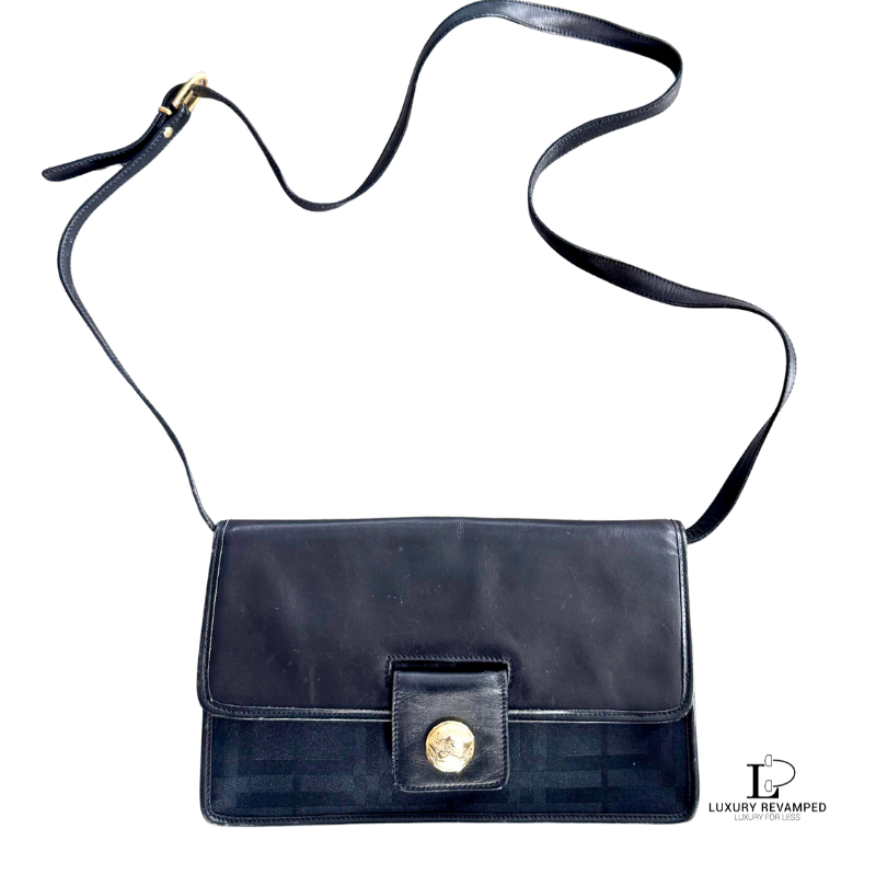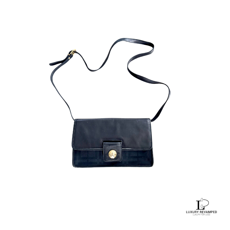 Rectangular shaped with a flap to close. Black nova check body with leather flap and shoulder strap. Round gold button with ‘Burberrys’ stamped accents the bag.