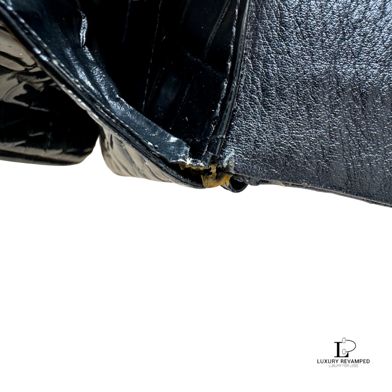 A small portion of dry area in front, a small cut in the strap and tiny cut on the top corners of the bag when the flap is lifted (not seen outside). Fading on gold hardware