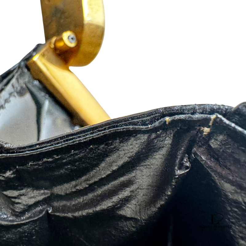Great vintage condition. Tiny flaws and imperfections as noted below. Overall, the bag looks great as the minor imperfections are hardly seen when bag is worn.