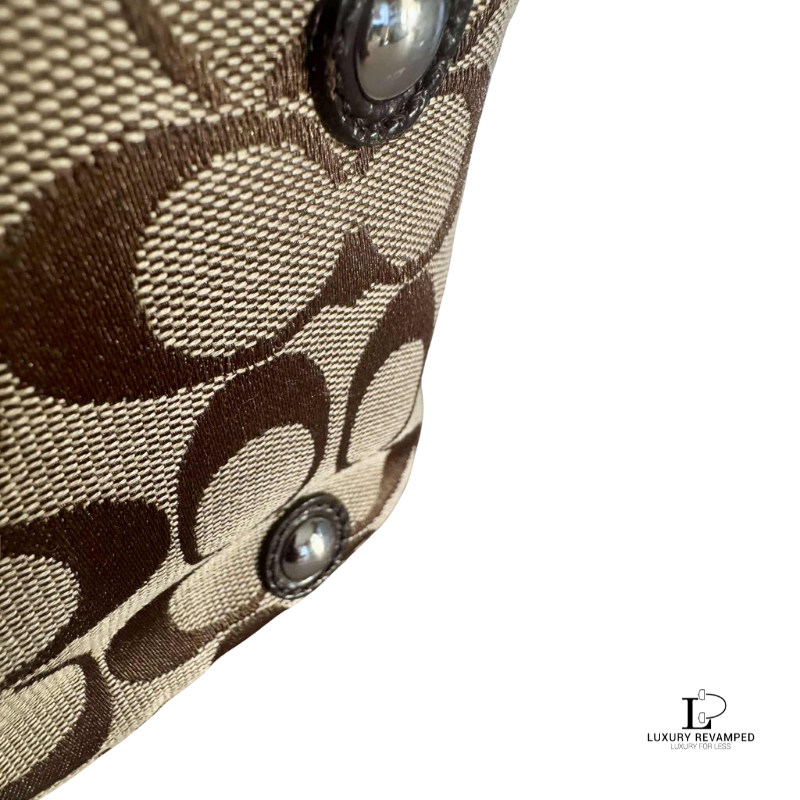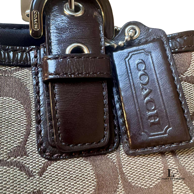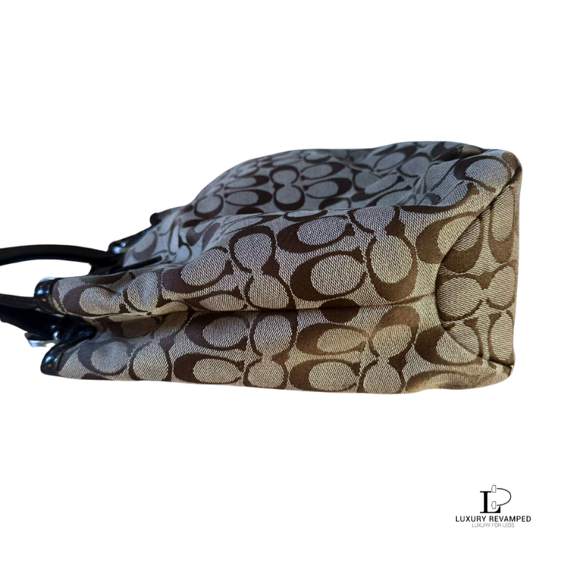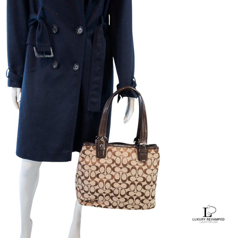 Made of canvas material printed with the popular Coach signature logo all over and accented by patent leather handles and trim.