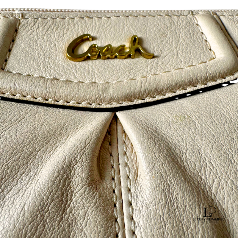 Gold tone hardware with ‘Coach’ metal logo in front. Main zip closure that opens to a spacious compartment with a medium pocket on one side and eight card slots on the other side.