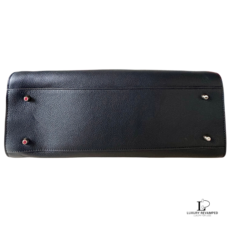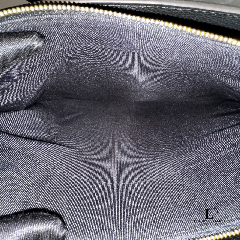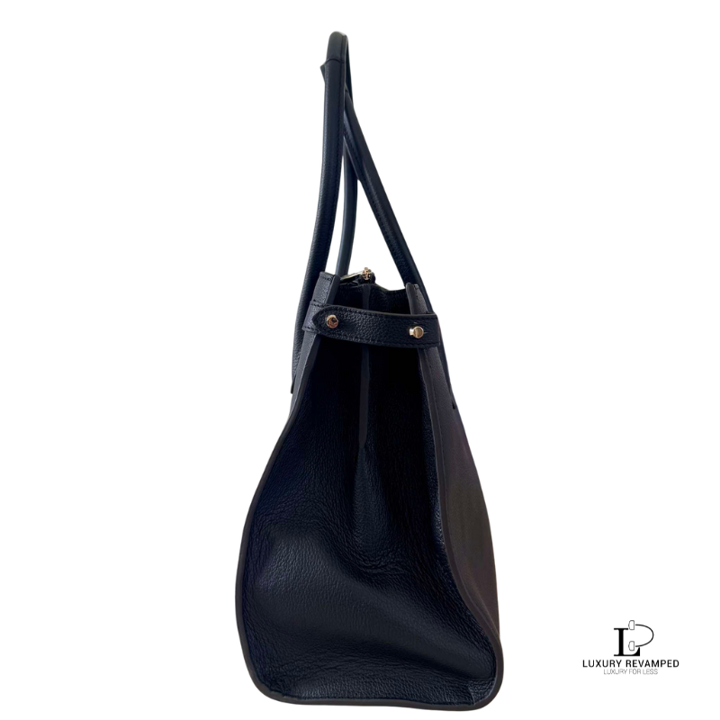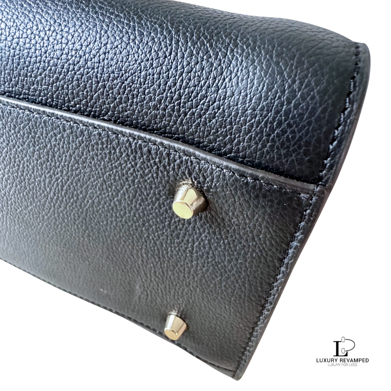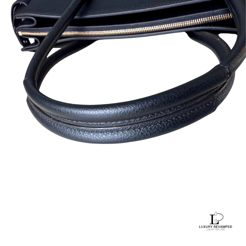 Made of grain leather in black color with gold hardware. Triple compartment with a huge zip compartment in the middle. One side has a large zip pocket and the other side has two medium pockets
