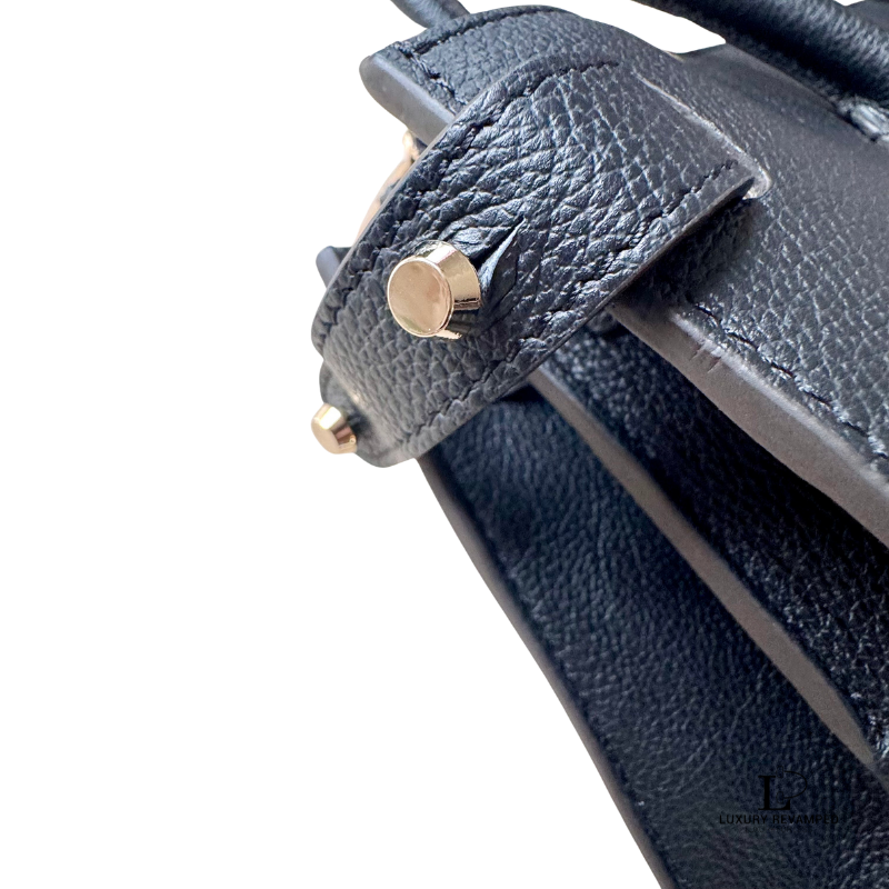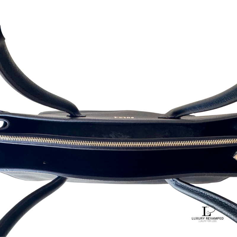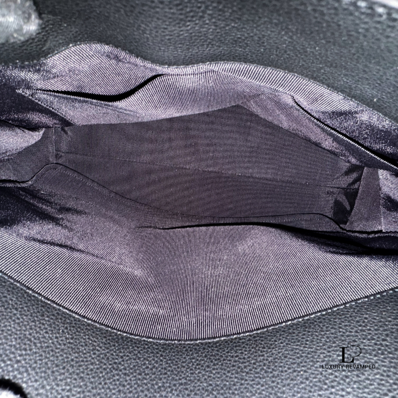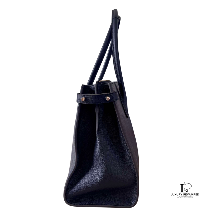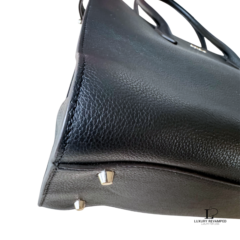 Made of grain leather in black color with gold hardware. Triple compartment with a huge zip compartment in the middle. One side has a large zip pocket and the other side has two medium pockets