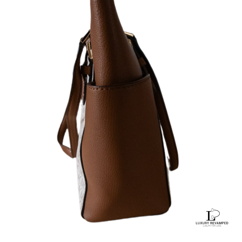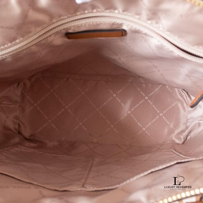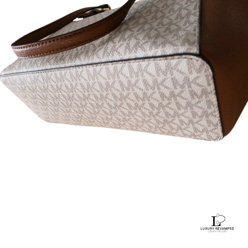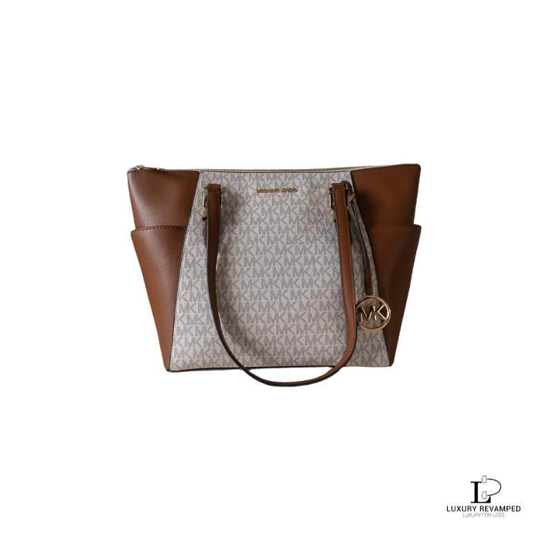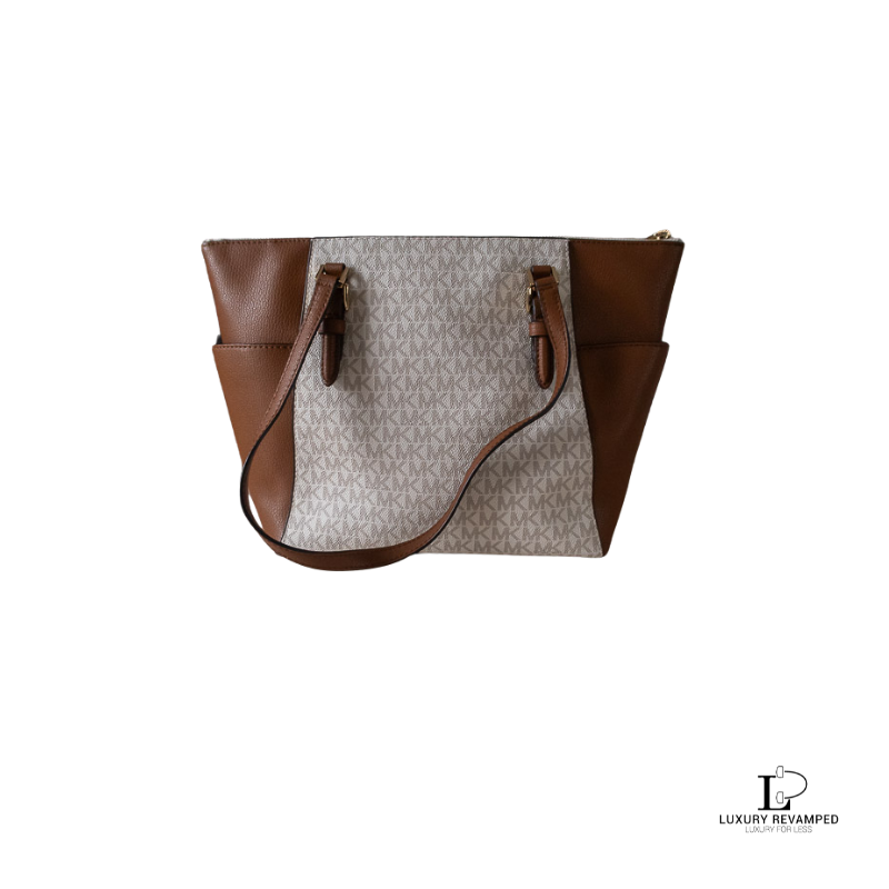 Spacious and functional with the iconic signature logo print, gold MK accent and two large side pockets.