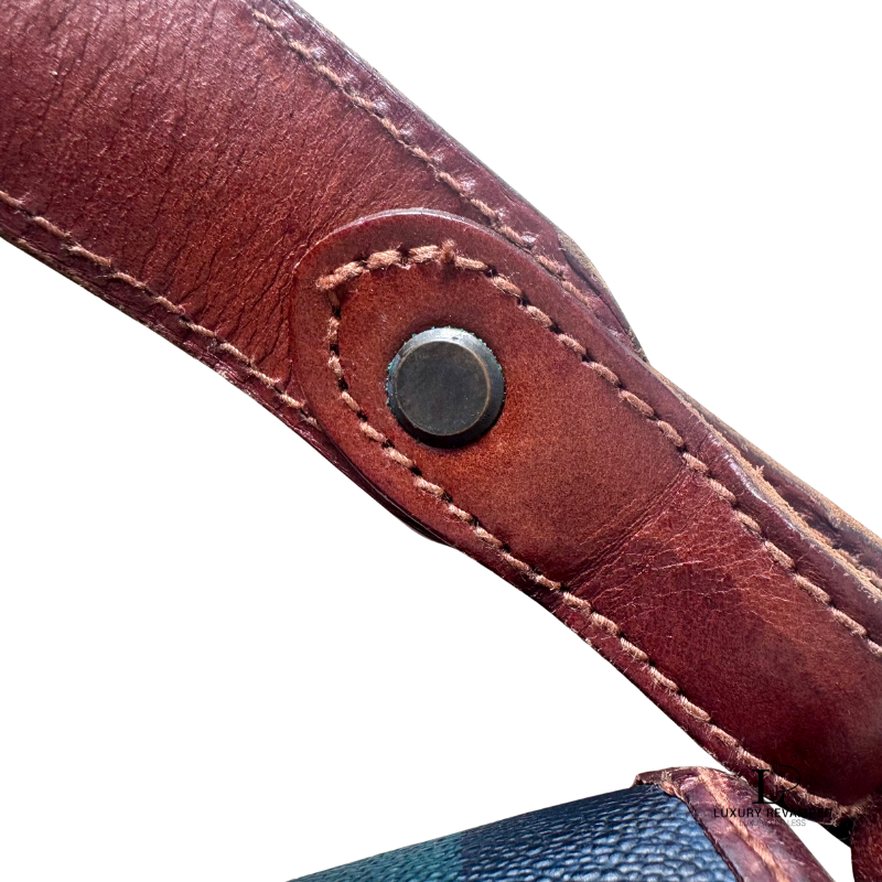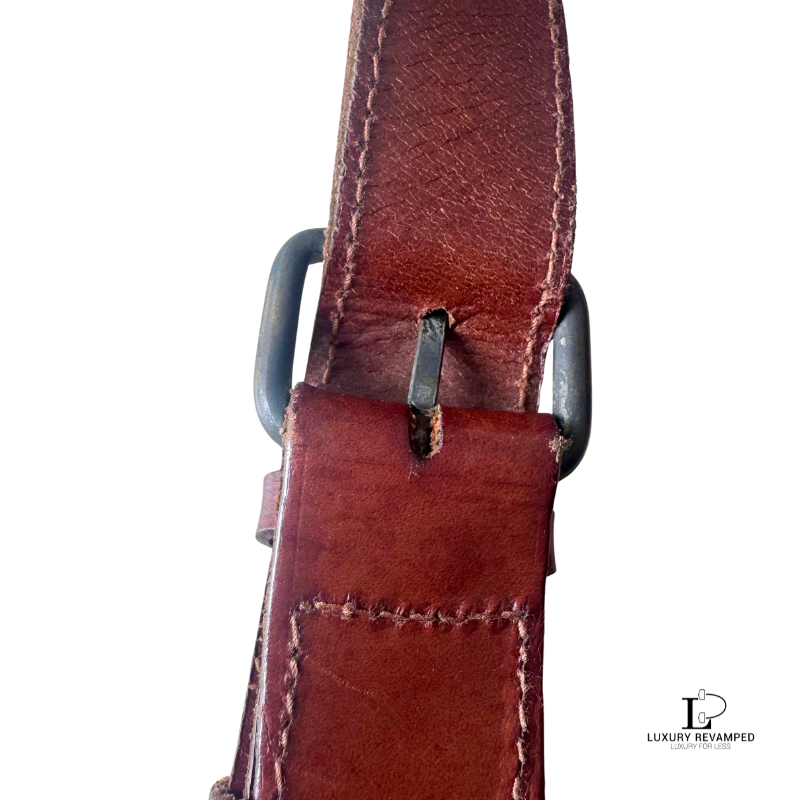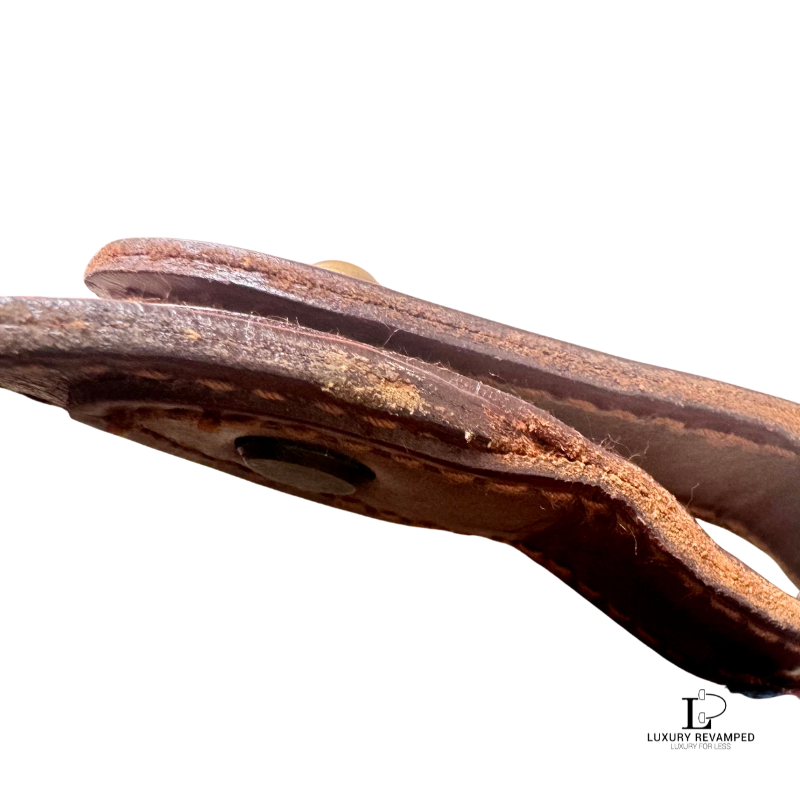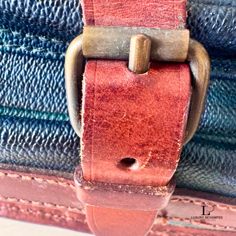 Great vintage contirion. General signs of usage like even darkening patina on leather strap and accent. Tarnishing on metal hardware and folds/creases on strap closure and straps.