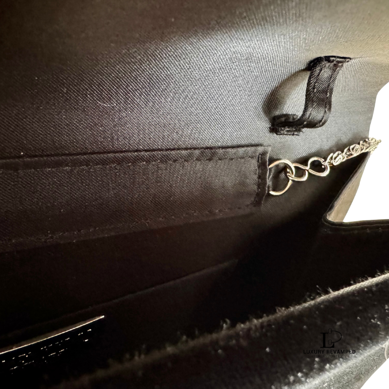 Main flap closure with a magnetic button closure. The bag has a spacious main compartment and a pocket on one side. This bag can be worn two ways as the strap can be hidden inside the bag and use as a clutch.