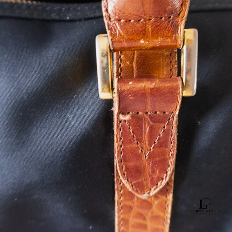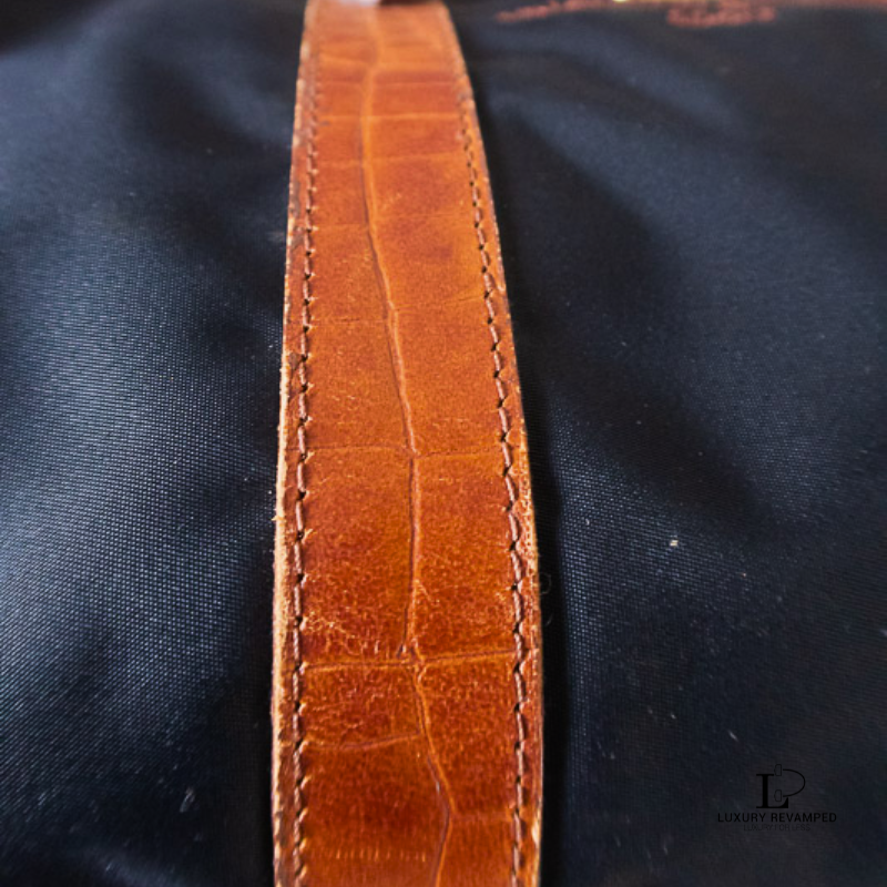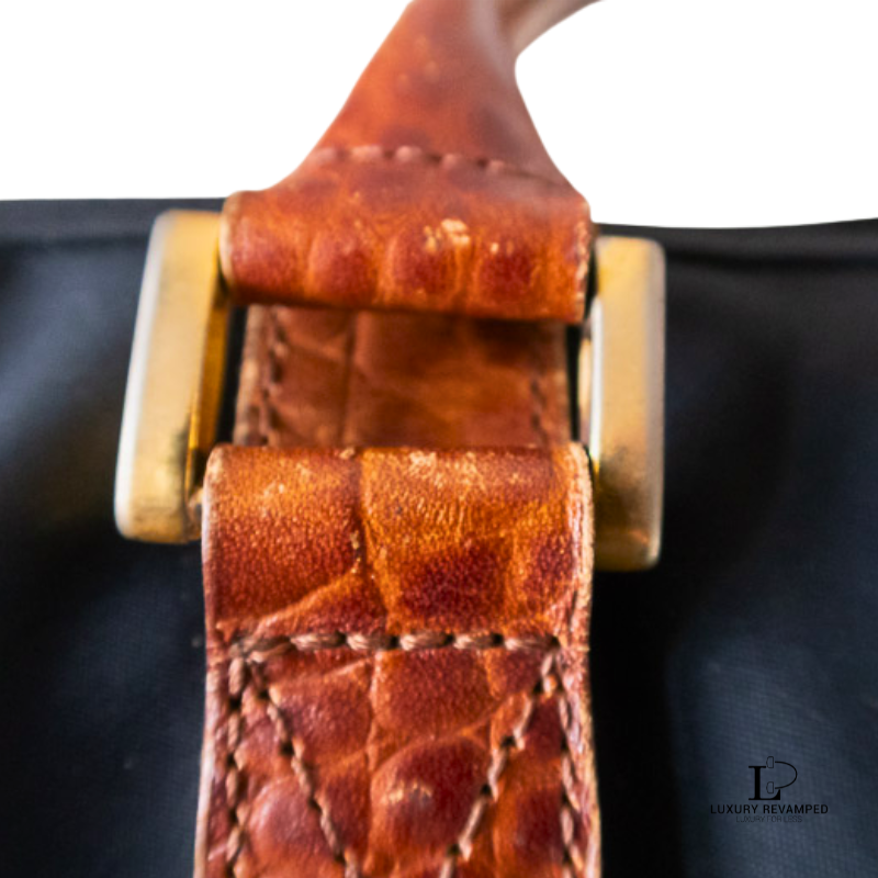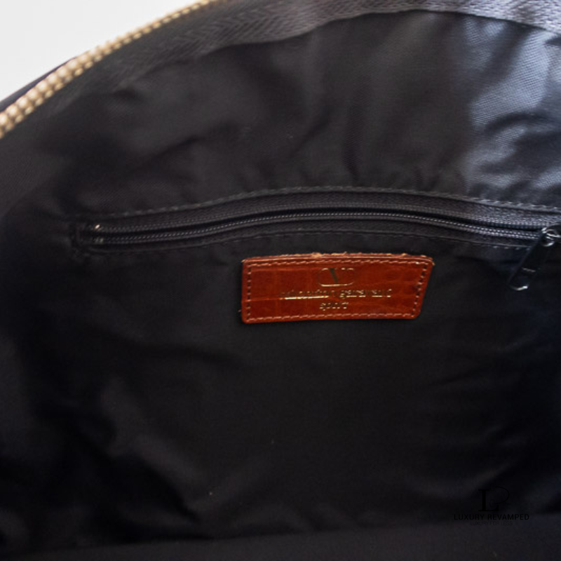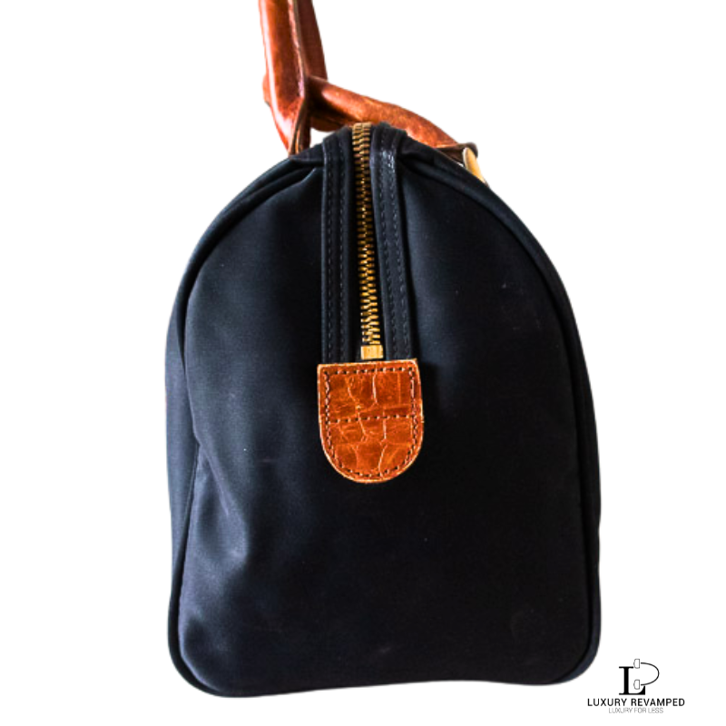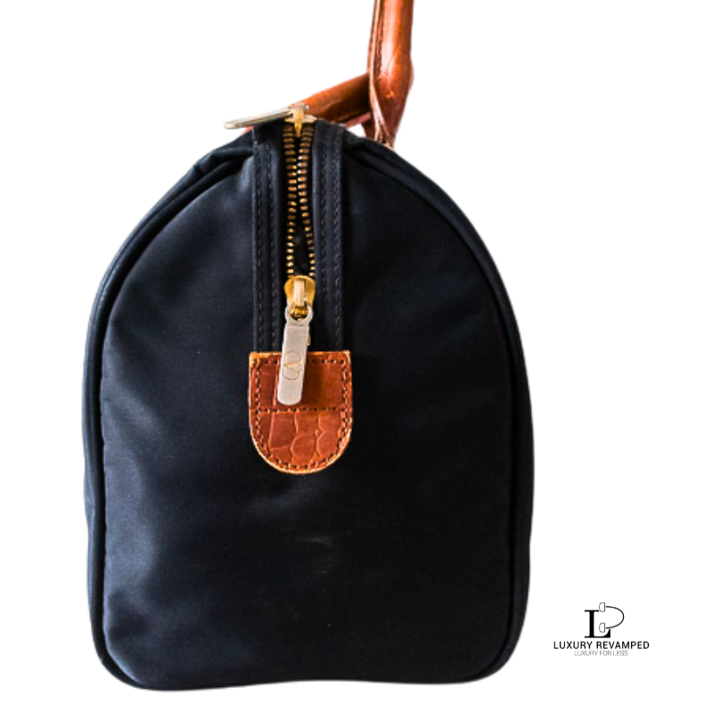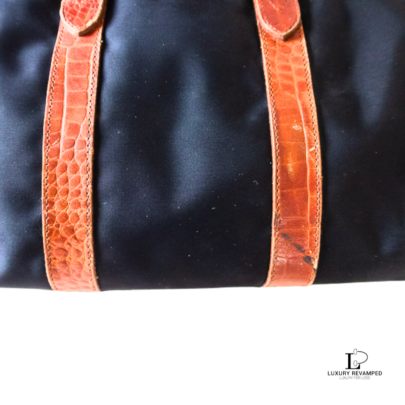 Main zip closure that opens to a spacious interior and a zip pocket on one side. Made of lightweight nylon material with leather moc croc trims and handles.