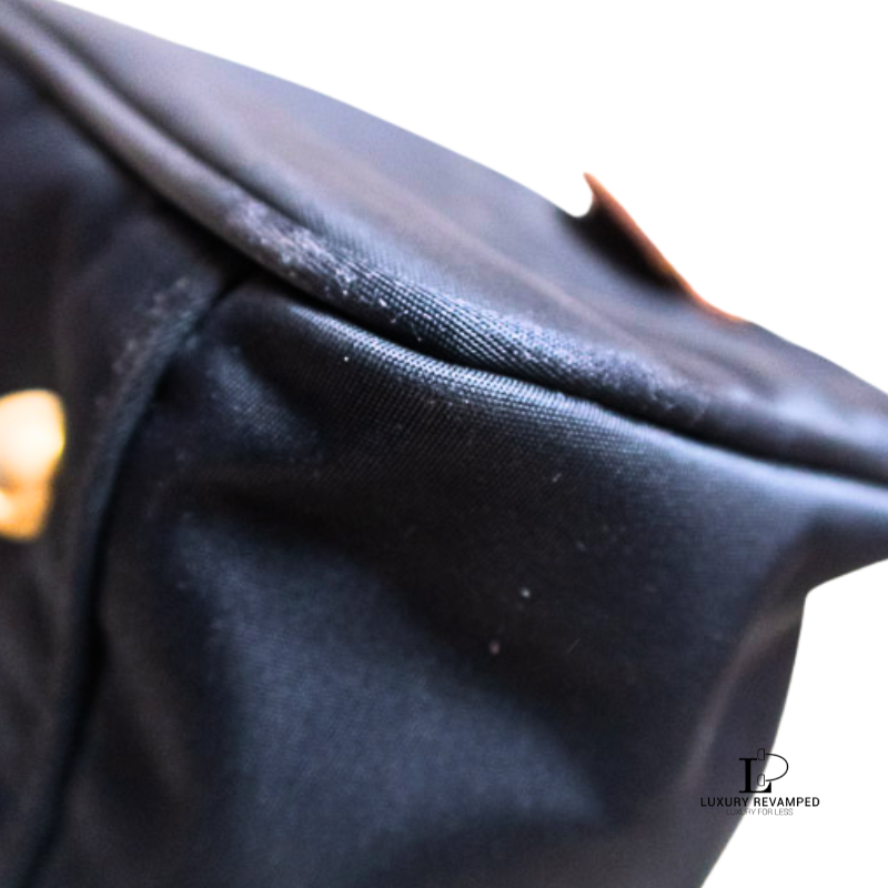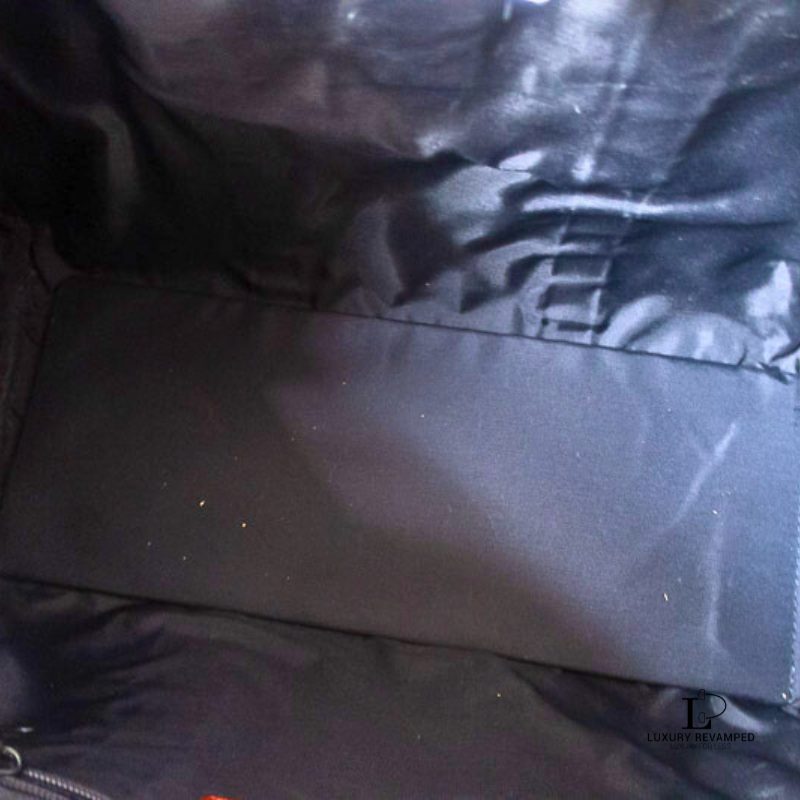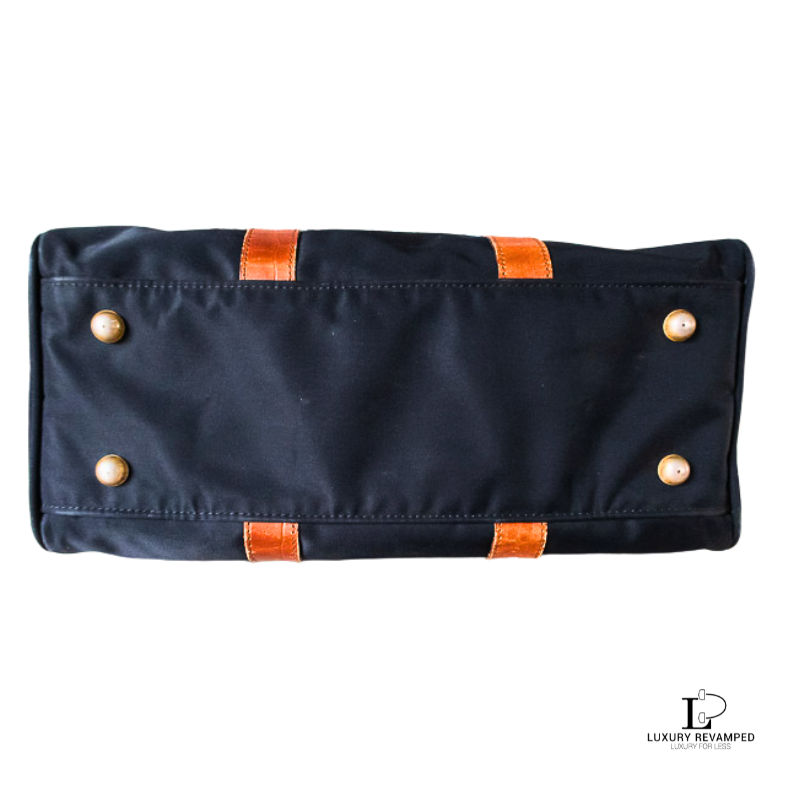 Flaw: General signs of usage like fading on metal hardware (footings and zip pullers), there is a tiny black mark in the leather trim at the back of the bag; a few tiny scuffs on handles; musty odor- may do well with a good clean and wash.