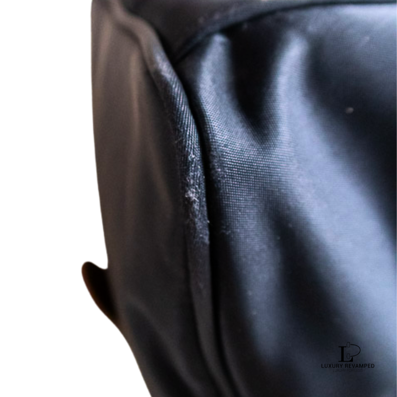 General signs of usage like fading on metal hardware (footings and zip pullers), there is a tiny black mark in the leather trim at the back of the bag; a few tiny scuffs on handles; musty odor- may do well with a good clean and wash.