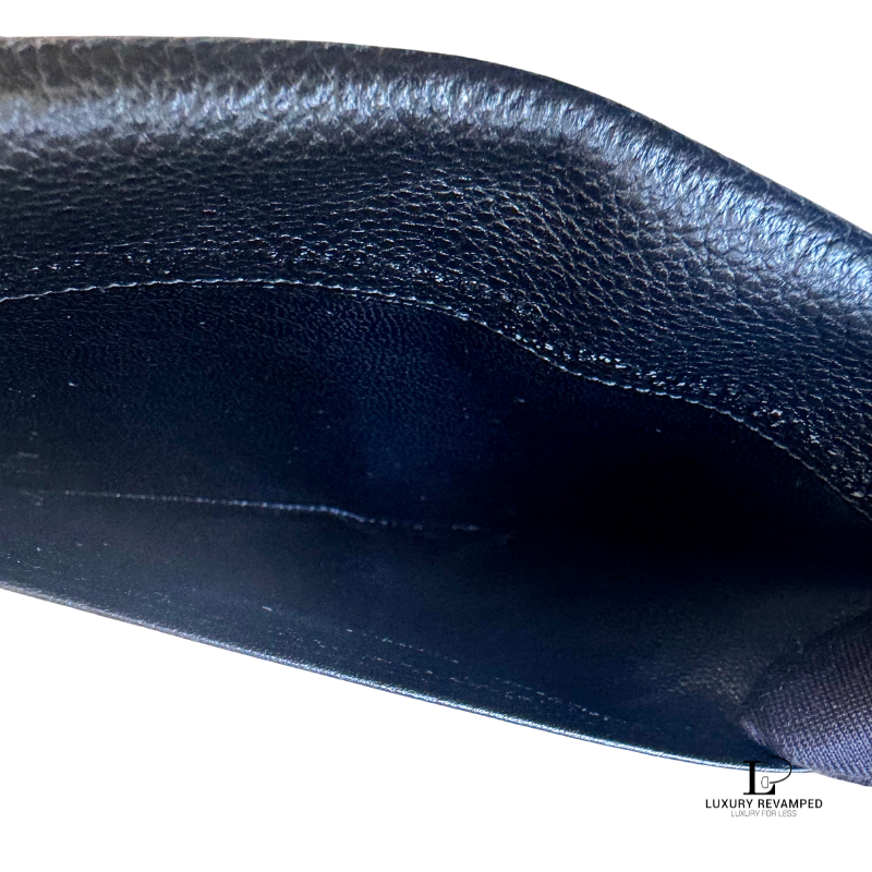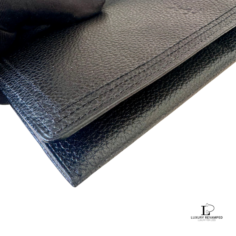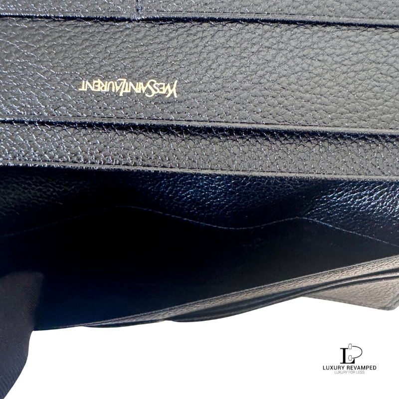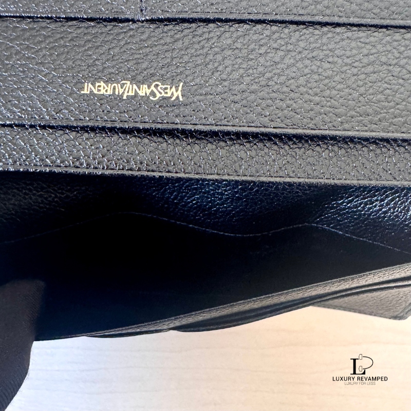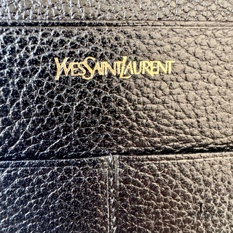 Bifold long wallet with a compartment at the back and embossed logo ‘YSL’ at the front. Made of grain leather, feels rich and luxurious. It opens to multiple card slots on both sides and a long compartment for bills.
