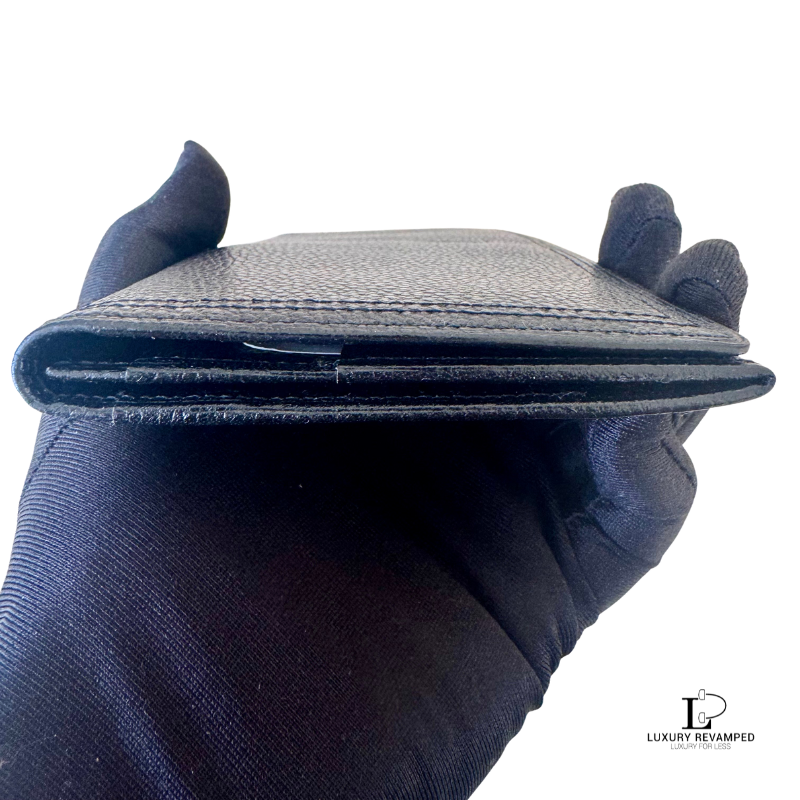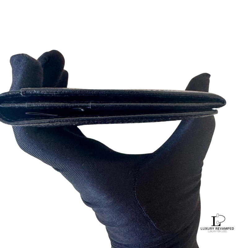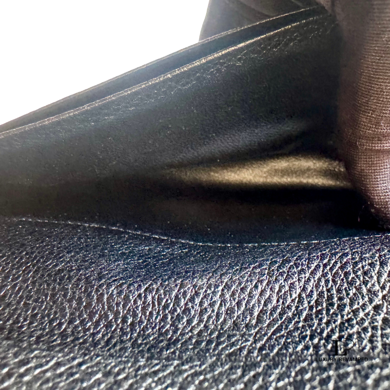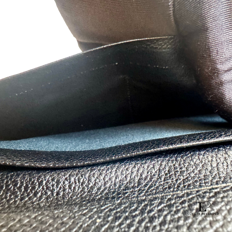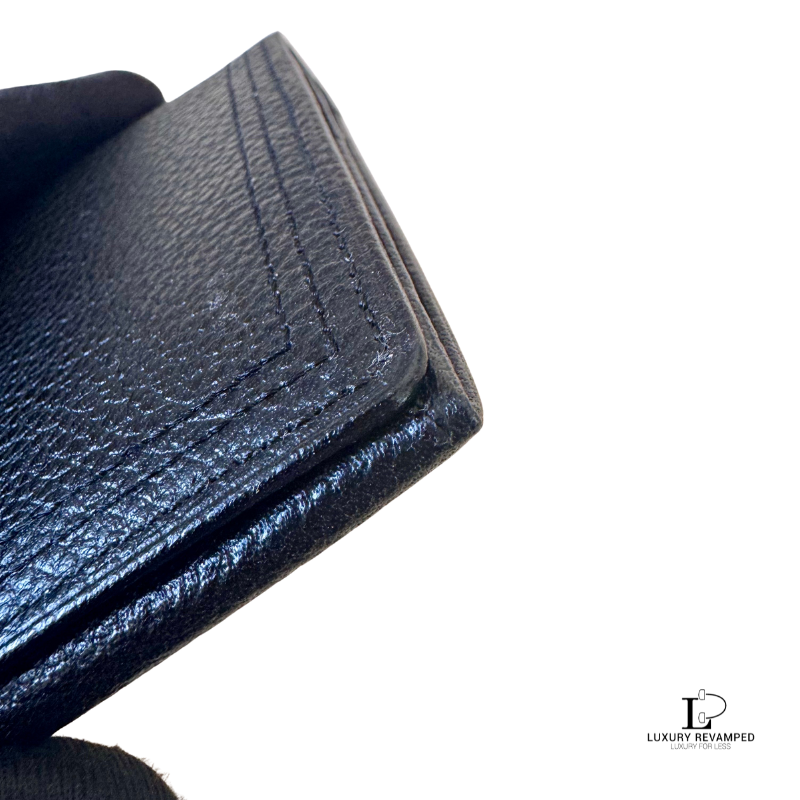 Bifold long wallet with a compartment at the back and embossed logo ‘YSL’ at the front. Made of grain leather, feels rich and luxurious. It opens to multiple card slots on both sides and a long compartment for bills.